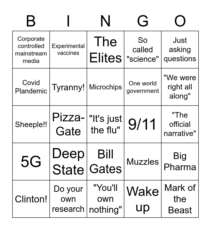 This bingo card has a free space and 24 words: Deep State, Do your own research, Microchips, Clinton!, Just asking questions, Corporate controlled mainstream media, Covid Plandemic, Experimental vaccines, 9/11, Bill Gates, One world government, Sheeple!!, Muzzles, Big Pharma, Tyranny!, Wake up, "The official narrative", The Elites, "We were right all along", Pizza-Gate, Mark of the Beast, 5G, So called "science" and "You'll own nothing".