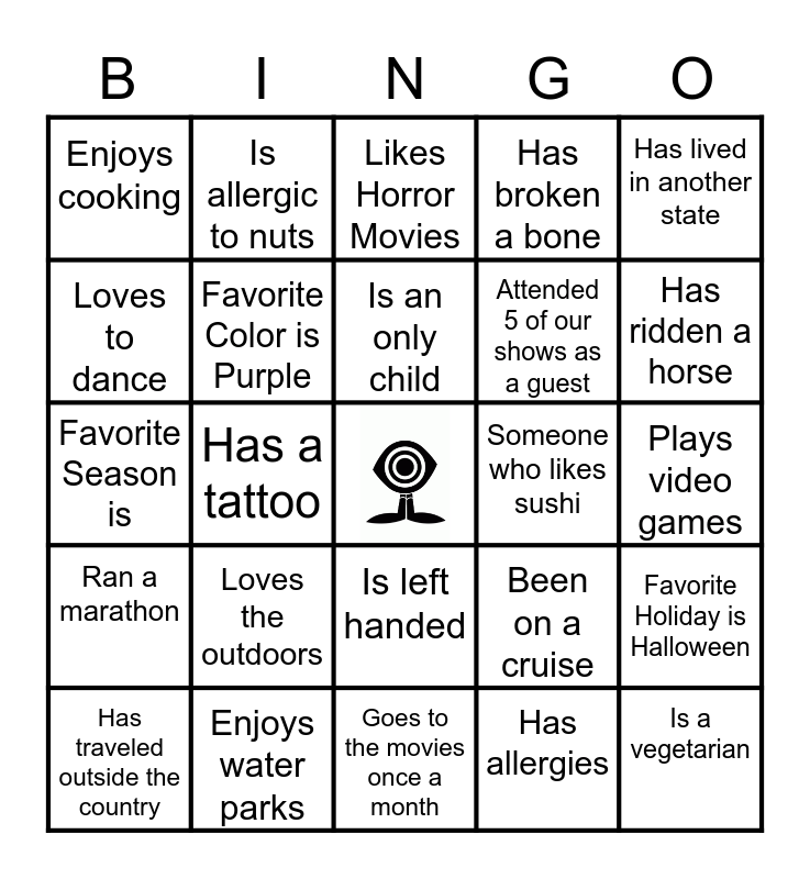 This bingo card has a free space and 39 words: Has lived in another country, Is a pet owner, Is a DJ, Favorite Color is Purple, Has traveled outside the country, Is left handed, Is an only child, Has a food Allergy, Has lived in another state, Ran a marathon, Has a tattoo, Has broken a bone, Is a vegetarian, Plays video games, Someone who likes sushi, Loves the outdoors, Can play an instrument, Enjoys cooking, Speaks a second language, Been on a cruise, Loves to dance, Goes to the movies once a month, Attended 5 of our shows as a guest, Has ridden a horse, Been Skydiving, Collects Vinyl Records, Has a gym membership, Has a passport, Plays Tennis, Is allergic to nuts, Rides motorcycles, Has been to Canada, Likes Horror Movies, Enjoys water parks, Has allergies, Plant Parent, Favorite Holiday is Halloween, Favorite Season is and Plays guitar.