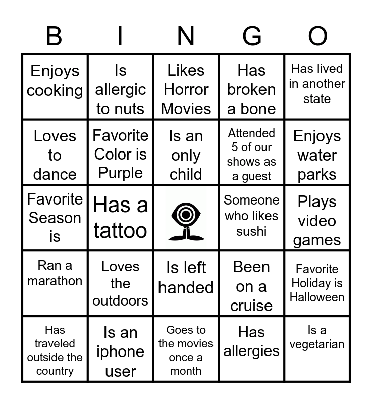 This bingo card has a free space and 39 words: Has lived in another country, Is a pet owner, Is a DJ, Favorite Color is Purple, Has traveled outside the country, Is left handed, Is an only child, Has a food Allergy, Has lived in another state, Ran a marathon, Has a tattoo, Has broken a bone, Is a vegetarian, Plays video games, Someone who likes sushi, Loves the outdoors, Can play an instrument, Enjoys cooking, Speaks a second language, Been on a cruise, Loves to dance, Goes to the movies once a month, Attended 5 of our shows as a guest, Enjoys water parks, Been Skydiving, Collects Vinyl Records, Has a gym membership, Has a passport, Plays Tennis, Is allergic to nuts, Rides motorcycles, Has been to Canada, Likes Horror Movies, Is an iphone user, Has allergies, Plant Parent, Favorite Holiday is Halloween, Favorite Season is and Plays guitar.