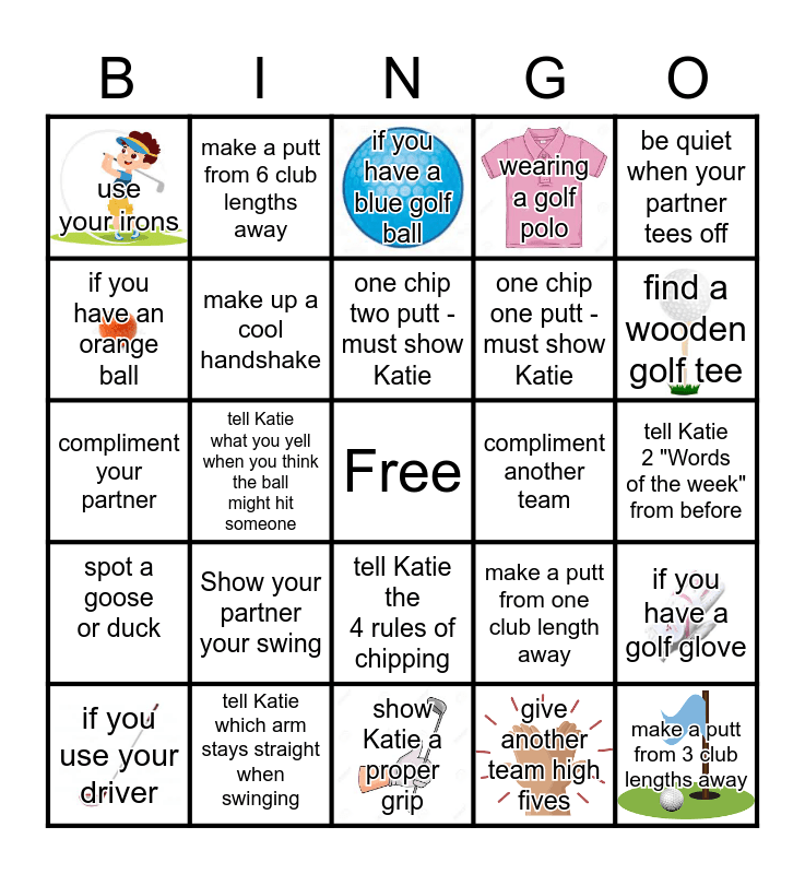 This bingo card has 10 images, a free space and 24 words: Show your partner your swing, tell Katie which arm stays straight when swinging, one chip two putt - must show Katie, if you use your driver, be quiet when your partner tees off, use your irons, if you have an orange ball, make a putt from 6 club lengths away, compliment another team, tell Katie the 4 rules of chipping, one chip one putt - must show Katie, compliment your partner, make a putt from one club length away, if you have a golf glove, make up a cool handshake, give another team high fives, tell Katie 2 "Words of the week" from before, if you have a blue golf ball, find a wooden golf tee, tell Katie what you yell when you think the ball might hit someone, make a putt from 3 club lengths away, spot a goose or duck, wearing a golf polo and show Katie a proper grip.