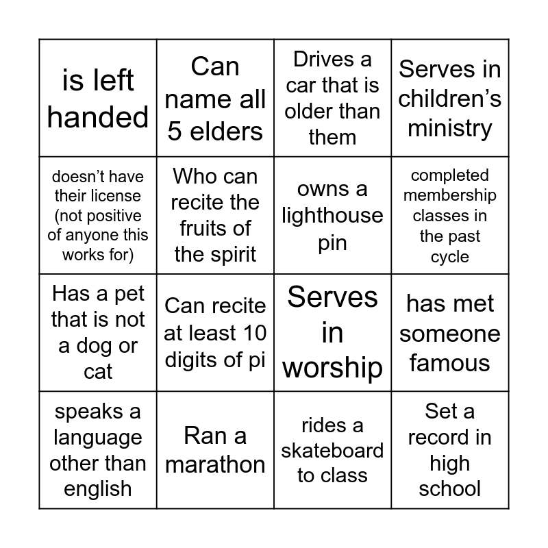 This bingo card has 27 words: Has more than 3 siblings, Was baptized before they were in high school, Has a pet that is not a dog or cat, Is a PK, Who can recite the fruits of the spirit, Drives a car that is older than them, Can name all 5 elders, Set a record in high school, Ran a marathon, Was baptized in the past year, Serves in worship, Serves in children’s ministry, Serves in bridge, Has attended lighthouse their whole life, Can recite at least 10 digits of pi, Is attending from out of state, owns a lighthouse pin, completed membership classes in the past cycle, has perfect pitch, is left handed, rides a skateboard to class, owns at least 10 pairs of shoes, has met someone famous, speaks a language other than english, can say the abcs backwards, doesn’t have their license (not positive of anyone this works for) and has been to more than one ACR.