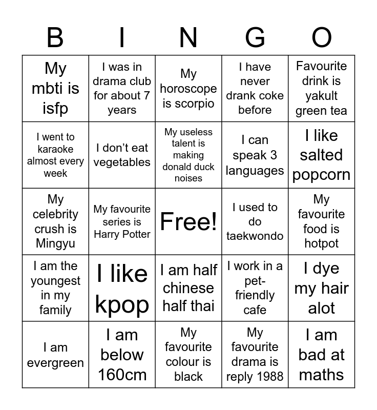 This bingo card has a free space and 24 words: I like kpop, I am below 160cm, My useless talent is making donald duck noises, I am evergreen, Favourite drink is yakult green tea, My mbti is isfp, I went to karaoke almost every week, I was in drama club for about 7 years, I used to do taekwondo, I am half chinese half thai, I can speak 3 languages, My celebrity crush is Mingyu, I work in a pet-friendly cafe, I dye my hair alot, I don’t eat vegetables, My favourite drama is reply 1988, My favourite food is hotpot, My horoscope is scorpio, I like salted popcorn, My favourite series is Harry Potter, I am bad at maths, I am the youngest in my family, I have never drank coke before and My favourite colour is black.