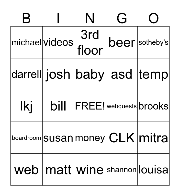 This bingo card has a free space and 24 words: susan, matt, baby, web, sotheby's, michael, darrell, videos, webquests, money, asd, lkj, CLK, mitra, josh, shannon, brooks, 3rd floor, temp, bill, louisa, boardroom, beer and wine.