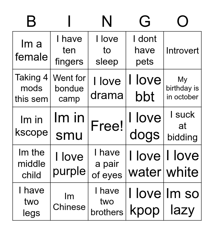 This bingo card has a free space and 24 words: I love purple, Im Chinese, I love drama, I have two legs, Introvert, Im a female, Taking 4 mods this sem, I have ten fingers, I love dogs, I have a pair of eyes, I love bbt, Im in kscope, I love water, I love white, Went for bondue camp, I love kpop, I suck at bidding, I love to sleep, My birthday is in october, Im in smu, Im so lazy, Im the middle child, I dont have pets and I have two brothers.