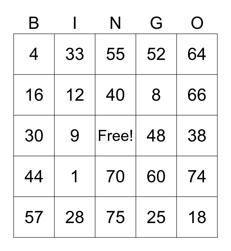 This bingo card has a free space and 24 words: 1, 28, 40, 57, 64, 4, 16, 33, 48, 70, 8, 30, 60, 74, 12, 25, 38, 55, 66, 9, 18, 44, 52 and 75.