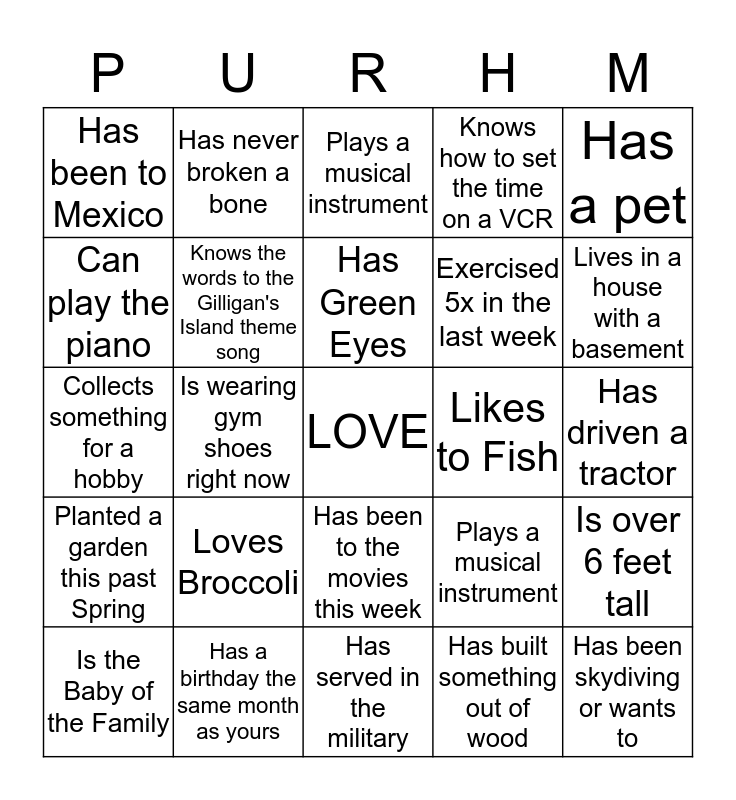 This bingo card has a free space and 24 words: Loves Broccoli, Has a birthday the same month as yours, Has Green Eyes, Is the Baby of the Family, Has a pet, Has been to Mexico, Can play the piano, Has never broken a bone, Likes to Fish, Has been to the movies this week, Exercised 5x in the last week, Collects something for a hobby, Plays a musical instrument, Is over 6 feet tall, Knows the words to the Gilligan's Island theme song, Has built something out of wood, Has driven a tractor, Plays a musical instrument, Lives in a house with a basement, Is wearing gym shoes right now, Has been skydiving or wants to, Planted a garden this past Spring, Knows how to set the time on a VCR and Has served in the military.