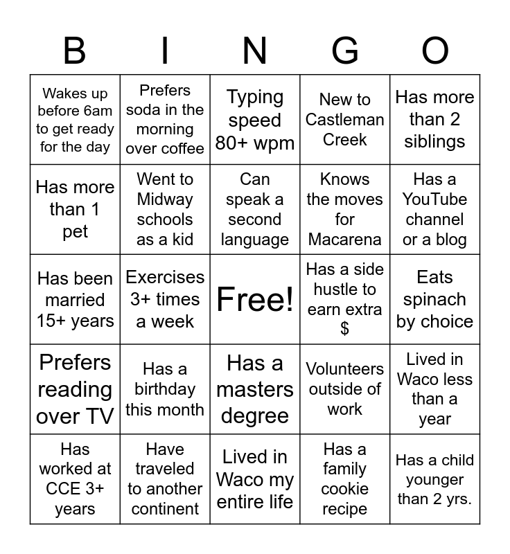 This bingo card has a free space and 24 words: Has a birthday this month, Have traveled to another continent, Can speak a second language, Has worked at CCE 3+ years, Has more than 2 siblings, Wakes up before 6am to get ready for the day, Has more than 1 pet, Prefers soda in the morning over coffee, Has a side hustle to earn extra $, Has a masters degree, Knows the moves for Macarena, Has been married 15+ years, Volunteers outside of work, Lived in Waco less than a year, Went to Midway schools as a kid, Has a family cookie recipe, Eats spinach by choice, Typing speed 80+ wpm, Has a YouTube channel or a blog, Exercises 3+ times a week, Has a child younger than 2 yrs., Prefers reading over TV, New to Castleman Creek and Lived in Waco my entire life.