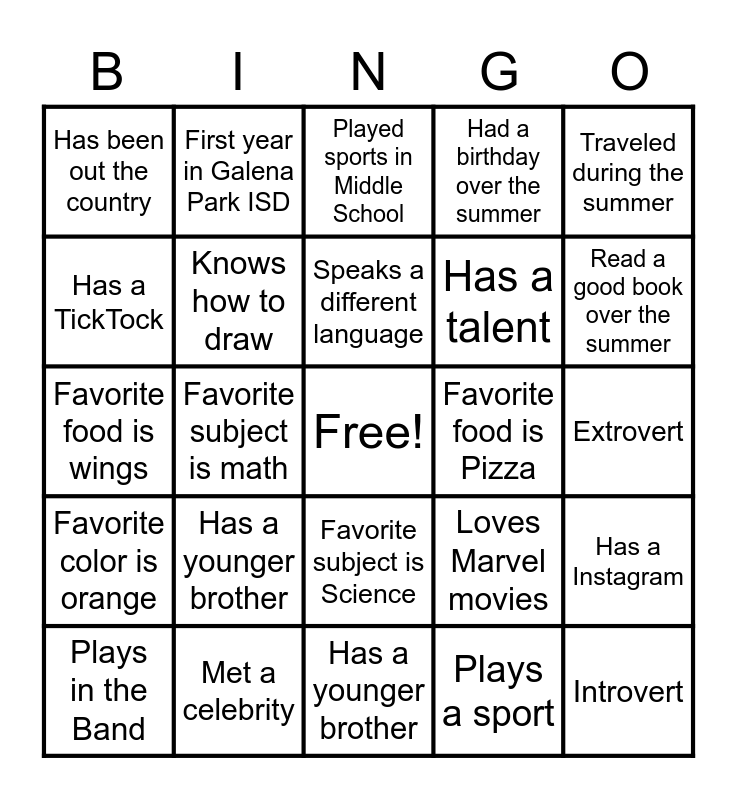 This bingo card has a free space and 24 words: Plays in the Band, Has a younger brother, Speaks a different language, Plays a sport, Traveled during the summer, Has been out the country, First year in Galena Park ISD, Played sports in Middle School, Favorite food is Pizza, Extrovert, Favorite food is wings, Knows how to draw, Loves Marvel movies, Has a Instagram, Has a TickTock, Met a celebrity, Has a younger brother, Had a birthday over the summer, Read a good book over the summer, Favorite color is orange, Favorite subject is math, Favorite subject is Science, Has a talent and Introvert.