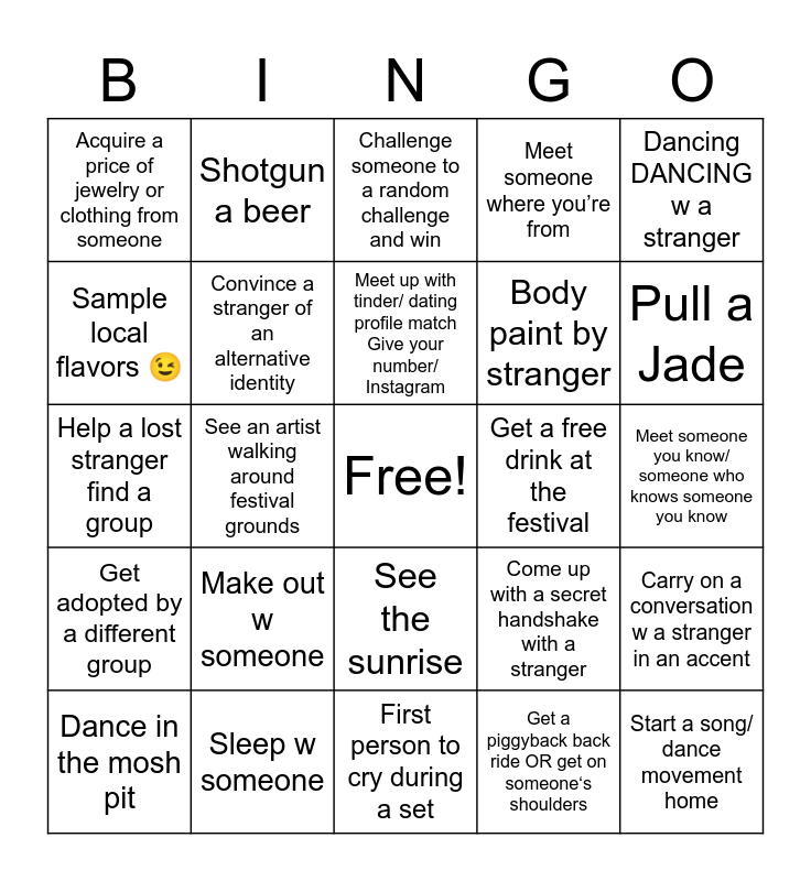 This bingo card has a free space and 24 words: Make out w someone, Sleep w someone, Meet up with tinder/ dating profile match Give your number/ Instagram, Dance in the mosh pit, Dancing DANCING w a stranger, Acquire a price of jewelry or clothing from someone, Sample local flavors 😉, Shotgun a beer, Get a free drink at the festival, See the sunrise, Body paint by stranger, Help a lost stranger find a group, Come up with a secret handshake with a stranger, Carry on a conversation w a stranger in an accent, Convince a stranger of an alternative identity, Get a piggyback back ride OR get on someone‘s shoulders, Meet someone you know/ someone who knows someone you know, Challenge someone to a random challenge and win, Pull a Jade, See an artist walking around festival grounds, Start a song/ dance movement home, Get adopted by a different group, Meet someone where you’re from and First person to cry during a set.