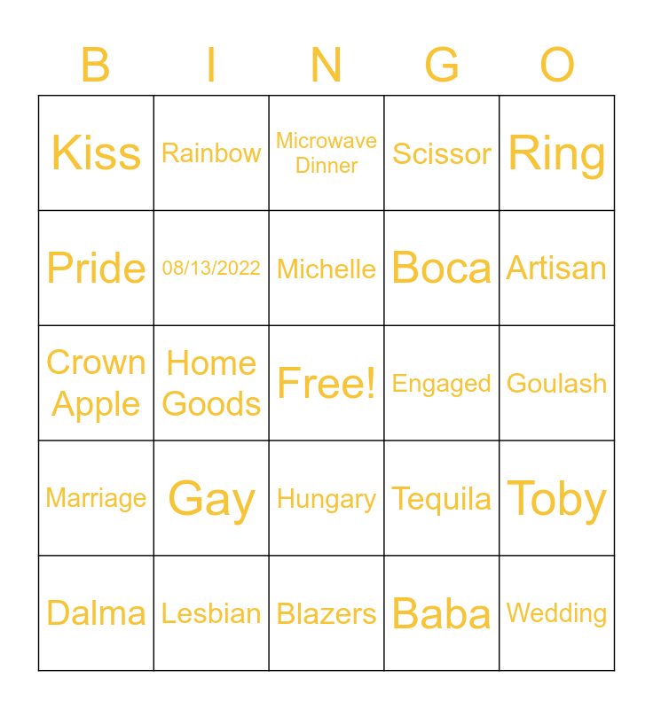This bingo card has a free space and 24 words: Gay, Lesbian, Michelle, Dalma, Ring, Kiss, Pride, Rainbow, Engaged, Hungary, Boca, Crown Apple, Tequila, Toby, 08/13/2022, Baba, Goulash, Microwave Dinner, Artisan, Home Goods, Wedding, Marriage, Scissor and Blazers.