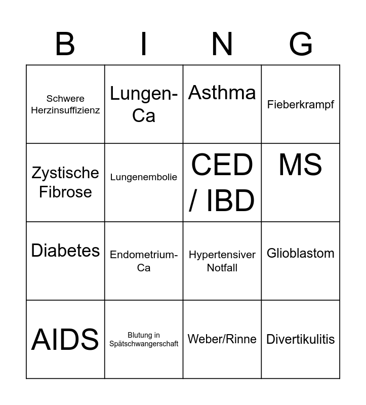 This bingo card has 16 words: Blutung in Spätschwangerschaft, Glioblastom, Asthma, Schwere Herzinsuffizienz, Diabetes, Lungen-Ca, Hypertensiver Notfall, Weber/Rinne, Zystische Fibrose, Lungenembolie, AIDS, Fieberkrampf, Endometrium-Ca, MS, CED / IBD and Divertikulitis.