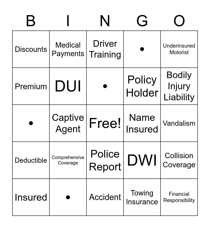 This bingo card has a free space and 31 words: Accident, At Fault, Captive Agent, Claim, Discounts, Driver Training, DUI, DWI, Name Insured, Towing Insurance, Vandalism, Financial Responsibility, Good Student Discount, Hands-Free Law, Bodily Injury Liability, Injury, Collision Coverage, Comprehensive Coverage, Deductible, Police Report, Underinsured Motorist, Insurance Policy, Insured, Medical Payments, Policy Holder, Premium, •, •, •, • and •.