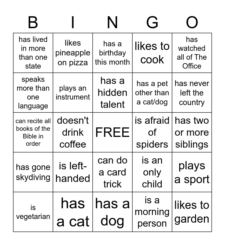 This bingo card has a free space and 24 words: is left-handed, has a cat, has a hidden talent, is vegetarian, has watched all of The Office, has lived in more than one state, speaks more than one language, likes pineapple on pizza, is afraid of spiders, can do a card trick, has a pet other than a cat/dog, can recite all books of the Bible in order, is an only child, plays a sport, plays an instrument, is a morning person, has two or more siblings, has a birthday this month, has never left the country, doesn't drink coffee, likes to garden, has gone skydiving, likes to cook and has a dog.