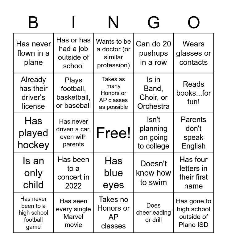 This bingo card has a free space and 24 words: Has been to a concert in 2022, Has seen every single Marvel movie, Takes as many Honors or AP classes as possible, Has never been to a high school football game, Wears glasses or contacts, Has never flown in a plane, Already has their driver's license, Has or has had a job outside of school, Isn't planning on going to college, Has blue eyes, Is in Band, Choir, or Orchestra, Has played hockey, Doesn't know how to swim, Has four letters in their first name, Plays football, basketball, or baseball, Does cheerleading or drill, Parents don't speak English, Wants to be a doctor (or similar profession), Reads books...for fun!, Has never driven a car, even with parents, Has gone to high school outside of Plano ISD, Is an only child, Can do 20 pushups in a row and Takes no Honors or AP classes.