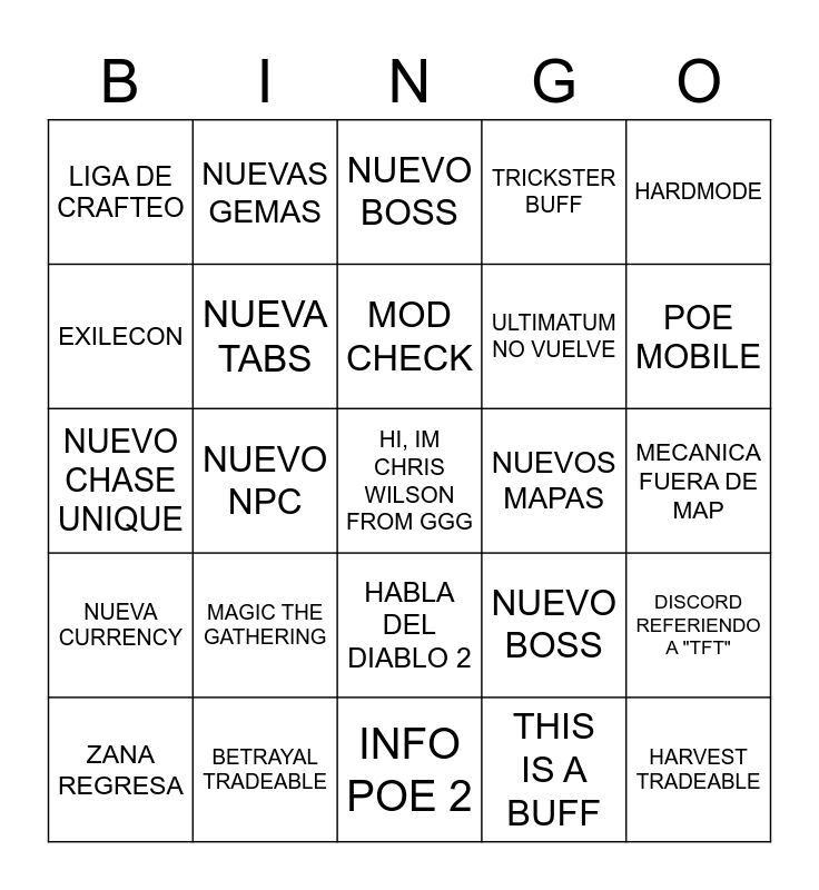 This bingo card has a free space and 24 words: MAGIC THE GATHERING, BETRAYAL TRADEABLE, MOD CHECK, ZANA REGRESA, HARDMODE, LIGA DE CRAFTEO, EXILECON, NUEVAS GEMAS, NUEVOS MAPAS, HABLA DEL DIABLO 2, ULTIMATUM NO VUELVE, NUEVO CHASE UNIQUE, NUEVO BOSS, DISCORD REFERIENDO A "TFT", NUEVA TABS, THIS IS A BUFF, MECANICA FUERA DE MAP, NUEVO BOSS, POE MOBILE, NUEVO NPC, HARVEST TRADEABLE, NUEVA CURRENCY, TRICKSTER BUFF and INFO POE 2.