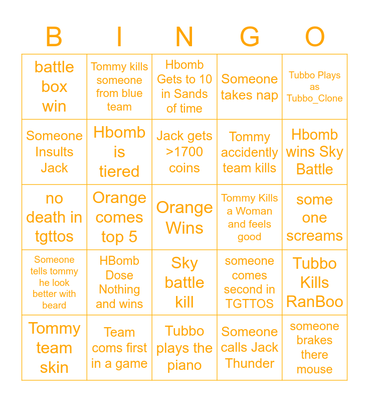 This bingo card has a free space and 24 words: HBomb Dose Nothing and wins, Team coms first in a game, Jack gets >1700 coins, Tommy team skin, Tubbo Plays as Tubbo_Clone, battle box win, Someone Insults Jack, Tommy kills someone from blue team, Tommy Kills a Woman and feels good, Sky battle kill, Tommy accidently team kills, no death in tgttos, someone comes second in TGTTOS, Tubbo Kills RanBoo, Hbomb is tiered, Someone calls Jack Thunder, some one screams, Hbomb Gets to 10 in Sands of time, Hbomb wins Sky Battle, Orange comes top 5, someone brakes there mouse, Someone tells tommy he look better with beard, Someone takes nap and Tubbo plays the piano.