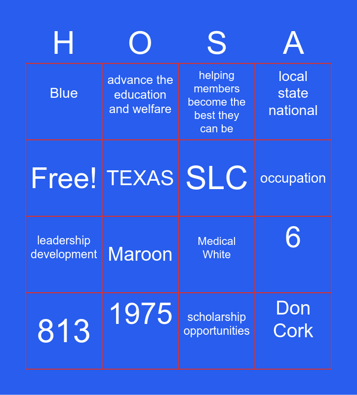 This bingo card has 16 words: 1975, 6, helping members become the best they can be, Blue, leadership development, advance the education and welfare, Medical White, scholarship opportunities, Free!, TEXAS, 813, local state national, Maroon, occupation, SLC and Don Cork.