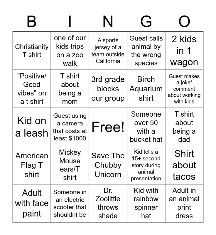 This bingo card has a free space and 24 words: Mickey Mouse ears/T shirt, Someone in an electric scooter that shouldnt be, 3rd grade blocks our group, Adult with face paint, 2 kids in 1 wagon, Christianity T shirt, "Positive/ Good vibes" on a t shirt, one of our kids trips on a zoo walk, Someone over 50 with a bucket hat, Save The Chubby Unicorn, Birch Aquarium shirt, Kid on a leash, Kid tells a 15+ second story during animal presentation, Shirt about tacos, T shirt about being a mom, Kid with rainbow spinner hat, T shirt about being a dad, A sports jersey of a team outside California, Guest makes a joke/ comment about working with kids, Guest using a camera that costs at least $1000, Adult in an animal print dress, American Flag T shirt, Guest calls animal by the wrong species and Dr. Zoolittle throws shade.