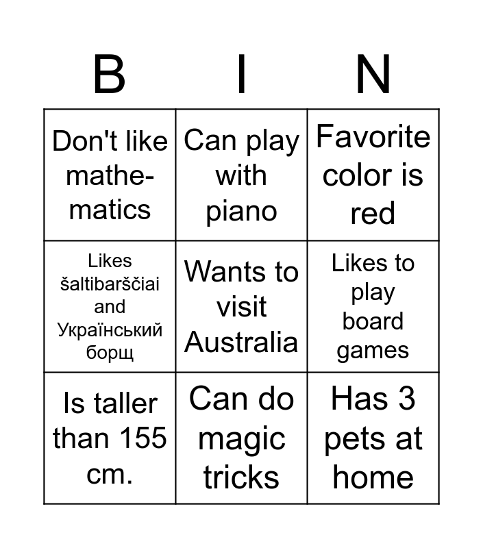 This bingo card has a free space and 8 words: Likes to play board games, Favorite color is red, Can play with piano, Is taller than 155 cm., Don't like mathe- matics, Has 3 pets at home, Likes šaltibarščiai and Український борщ and Can do magic tricks.