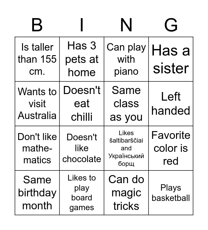This bingo card has 16 words: Likes to play board games, Favorite color is red, Can play with piano, Is taller than 155 cm., Don't like mathe- matics, Has 3 pets at home, Likes šaltibarščiai and Український борщ, Can do magic tricks, Wants to visit Australia, Doesn't eat chilli, Same birthday month, Has a sister, Doesn't like chocolate, Left handed, Same class as you and Plays basketball.