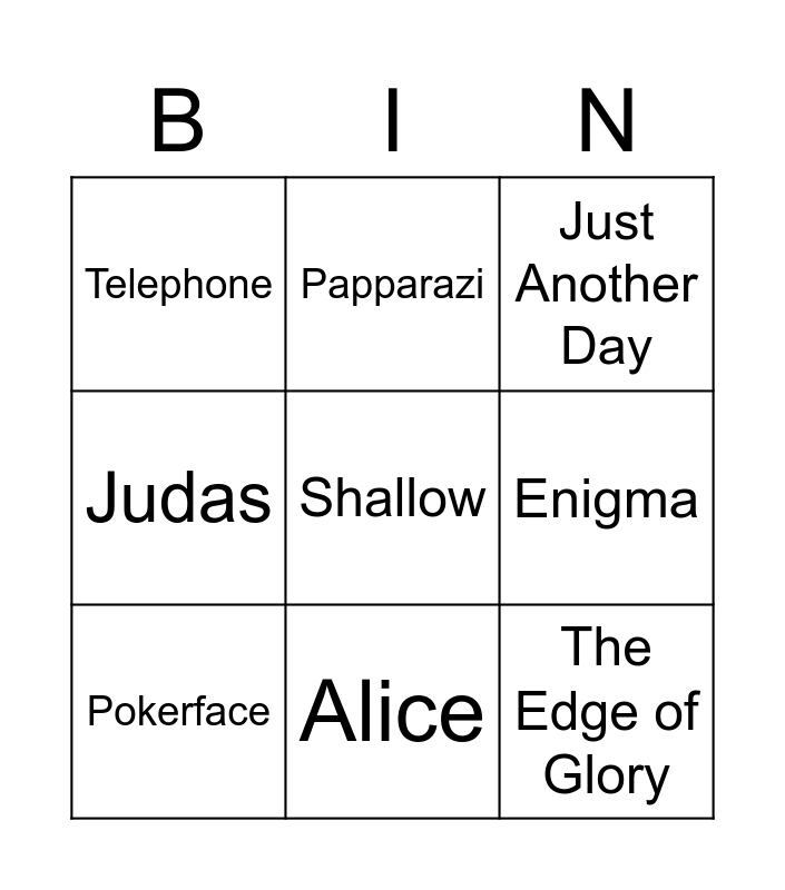This bingo card has a free space and 8 words: Enigma, Just Another Day, Papparazi, Pokerface, Telephone, The Edge of Glory, Judas and Alice.