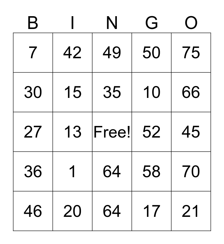 This bingo card has a free space and 24 words: 1, 20, 35, 46, 75, 7, 30, 42, 52, 64, 10, 27, 58, 70, 15, 17, 45, 49, 66, 13, 21, 36, 50 and 64.