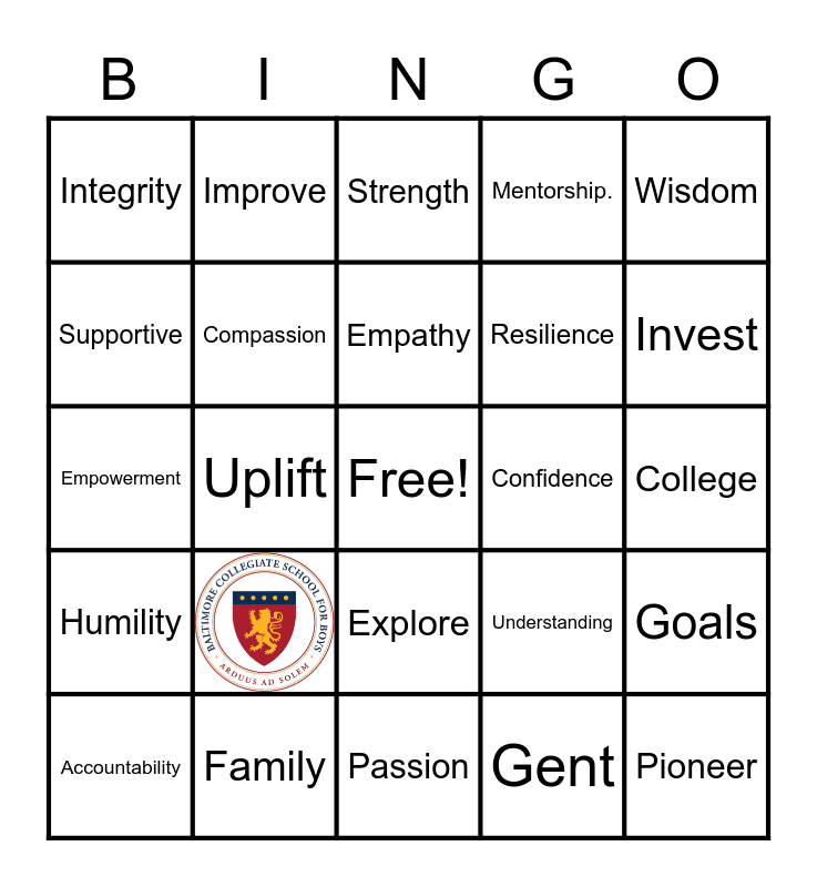 This bingo card has 1 images, a free space and 23 words: Family, Empathy, Accountability, Wisdom, Integrity, Supportive, Improve, Confidence, Explore, Resilience, Empowerment, Understanding, Goals, Compassion, Gent, College, Strength, Invest, Uplift, Pioneer, Humility, Mentorship. and Passion.