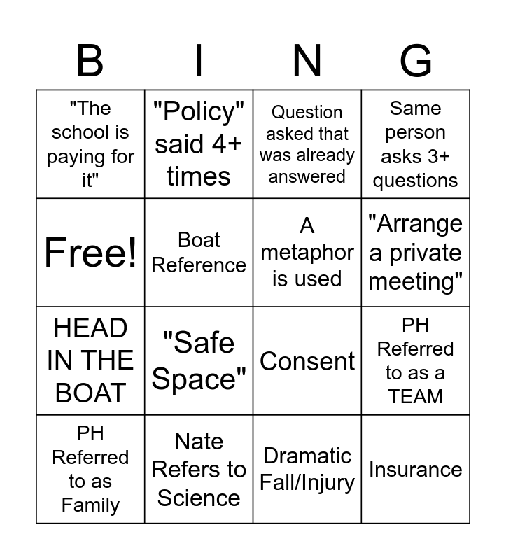 This bingo card has 18 words: Free!, Nate Refers to Science, Question asked that was already answered, Same person asks 3+ questions, HEAD IN THE BOAT, "Policy" said 4+ times, Consent, "Arrange a private meeting", "The school is paying for it", "Safe Space", Dramatic Fall/Injury, PH Referred to as a TEAM, PH Referred to as Family, Boat Reference, A metaphor is used, Insurance, Savings and Retirement.