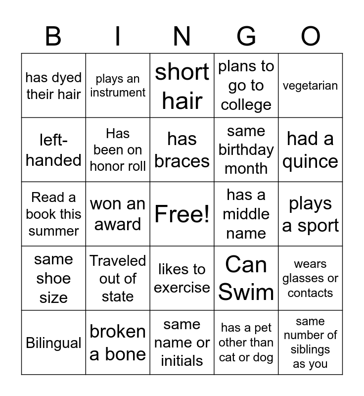 This bingo card has a free space and 24 words: Traveled out of state, broken a bone, has braces, Bilingual, vegetarian, has dyed their hair, left-handed, plays an instrument, has a middle name, likes to exercise, same birthday month, Read a book this summer, Can Swim, wears glasses or contacts, Has been on honor roll, has a pet other than cat or dog, plays a sport, short hair, had a quince, won an award, same number of siblings as you, same shoe size, plans to go to college and same name or initials.