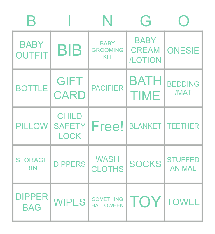 This bingo card has a free space and 24 words: DIPPERS, WIPES, PACIFIER, DIPPER BAG, ONESIE, BABY OUTFIT, BOTTLE, BIB, BLANKET, WASH CLOTHS, BATH TIME, PILLOW, SOCKS, STUFFED ANIMAL, GIFT CARD, TOY, TEETHER, BABY GROOMING KIT, BEDDING /MAT, CHILD SAFETY LOCK, TOWEL, STORAGE BIN, BABY CREAM /LOTION and SOMETHING HALLOWEEN.