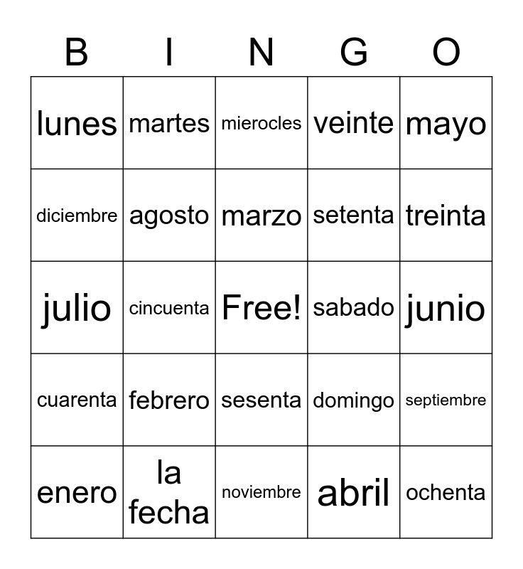 This bingo card has a free space and 24 words: enero, febrero, marzo, abril, mayo, lunes, martes, mierocles, sabado, junio, julio, agosto, domingo, septiembre, diciembre, la fecha, noviembre, veinte, treinta, cuarenta, cincuenta, sesenta, setenta and ochenta.