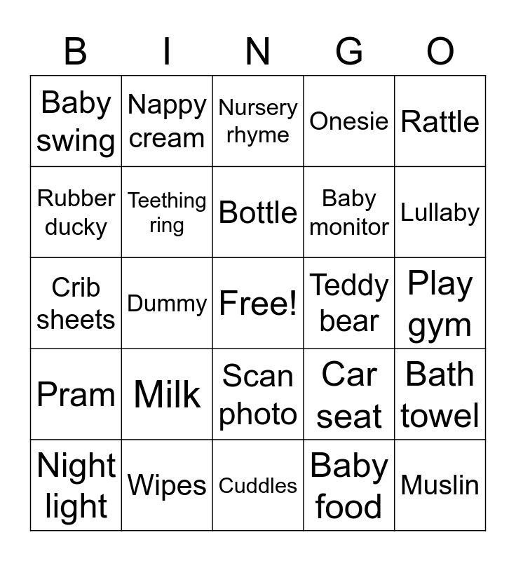 This bingo card has a free space and 24 words: Milk, Wipes, Bottle, Night light, Rattle, Baby swing, Rubber ducky, Nappy cream, Teddy bear, Scan photo, Baby monitor, Crib sheets, Car seat, Bath towel, Teething ring, Baby food, Play gym, Nursery rhyme, Lullaby, Dummy, Muslin, Pram, Onesie and Cuddles.