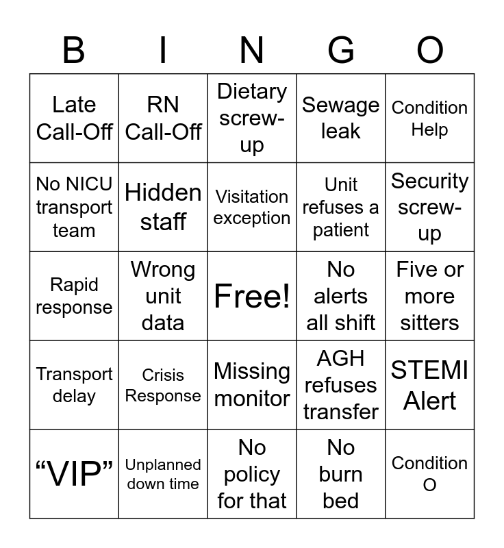This bingo card has a free space and 72 words: Fall, RN Call-Off, Wrong unit data, Service Recovery, OneCall mistake, Staffing sheets wrong, Sewage leak, Code Blue, Unit refuses a patient, Stroke Alert, “VIP”, Onc misses bed mtg, Security screw-up, Late Call-Off, No call no show, Rapid response, AGH refuses transfer, Condition Help, EVS delay, Five or more sitters, Crisis Response, Condition O, STEMI Alert, Five or more OneCalls pending, 10 or more boarders, CTB, Clean water leak, Planned down time, >2 units without PCT, Mice, Unplanned down time, Equipment failure, Fire alarm, Downstaff to home, No burn bed, No code bed, Higher level of care, Other infrastructure failure, No NICU transport team, Bed bugs, Missing monitor, Patient placement screw-up, Pharmacy issue, PCT Call-Off, Power failure, Transport delay, DOH / TJC on site, Cockroaches, Intubation STAT, Unreasonable staffing request, Director doesn’t answer phone, Exec doesn’t answer phone, Bring Inpatient OneCall to ED, No alerts all shift, Kronos wrong, Five or more OneCalls placed, Dietary screw-up, Visitation exception, ED wait > 3 hours, AGH on divert, Med/surg transfer by air, Elopement, AMA, No policy for that, Angry MD call, Clogged toilet, Hidden staff, Patient left; Still in EPIC, 6:1, “Is this the CHO”?, Surprise RN shows up and Patient refuses to leave.