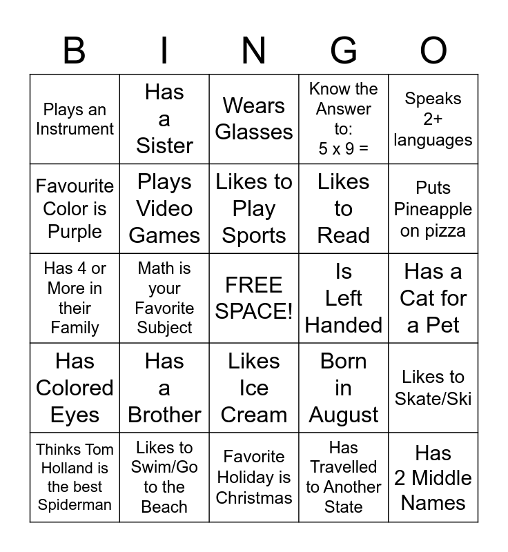 This bingo card has a free space and 24 words: Has a Brother, Likes to Swim/Go to the Beach, Likes to Play Sports, Thinks Tom Holland is the best Spiderman, Speaks 2+ languages, Plays an Instrument, Favourite Color is Purple, Has a Sister, Is Left Handed, Likes Ice Cream, Likes to Read, Has 4 or More in their Family, Born in August, Likes to Skate/Ski, Plays Video Games, Has Travelled to Another State, Has a Cat for a Pet, Wears Glasses, Puts Pineapple on pizza, Math is your Favorite Subject, Has 2 Middle Names, Has Colored Eyes, Know the Answer to: 5 x 9 = and Favorite Holiday is Christmas.