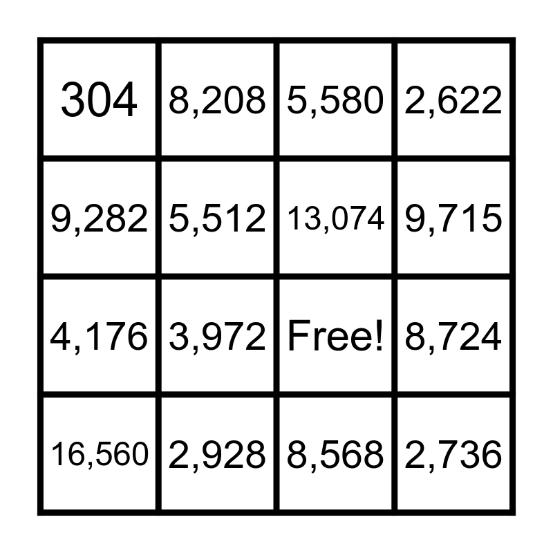This bingo card has 19 words: Free!, 455, 5,580, 2,736, 8,724, 9,282, 8,568, 304, 8,208, 4,176, 3,972, 5,512, 13,074, 2,928, 16,560, 216, 2,622, 9,715 and 3,145.