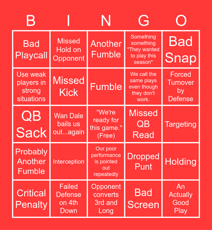 This bingo card has a free space and 24 words: Critical Penalty, Interception, Fumble, Bad Screen, Bad Snap, Bad Playcall, Missed Hold on Opponent, Another Fumble, Missed QB Read, Targeting, QB Sack, Missed Kick, Dropped Punt, Holding, Use weak players in strong situations, Failed Defense on 4th Down, Opponent converts 3rd and Long, Something something "They wanted to play this season", Forced Turnover by Defense, Probably Another Fumble, Wan Dale bails us out...again, Our poor performance is pointed out repeatedly, We call the same plays even though they don't work. and An Actually Good Play.