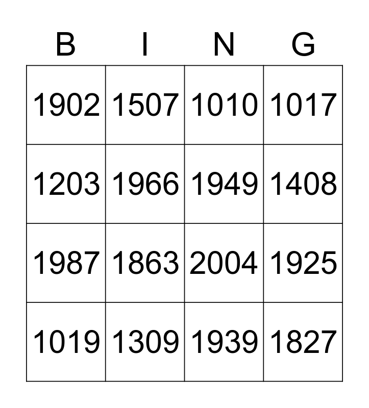 This bingo card has 25 words: 1954, 1882, 1408, 1991, 1203, 1902, 1966, 1507, 1309, 1973, 1987, 2004, 1935, 1860, 1949, 1904, 1939, 1010, 1863, 1925, 1019, 1961, 1827, 1017 and 1995.