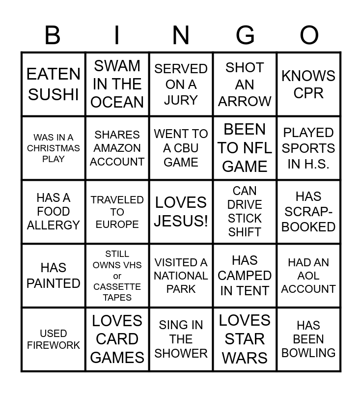 This bingo card has a free space and 24 words: STILL OWNS VHS or CASSETTE TAPES, LOVES CARD GAMES, WENT TO A CBU GAME, USED FIREWORK, KNOWS CPR, EATEN SUSHI, WAS IN A CHRISTMAS PLAY, SWAM IN THE OCEAN, CAN DRIVE STICK SHIFT, VISITED A NATIONAL PARK, BEEN TO NFL GAME, HAS A FOOD ALLERGY, HAS CAMPED IN TENT, HAD AN AOL ACCOUNT, SHARES AMAZON ACCOUNT, LOVES STAR WARS, HAS SCRAP-BOOKED, SERVED ON A JURY, PLAYED SPORTS IN H.S., TRAVELED TO EUROPE, HAS BEEN BOWLING, HAS PAINTED, SHOT AN ARROW and SING IN THE SHOWER.