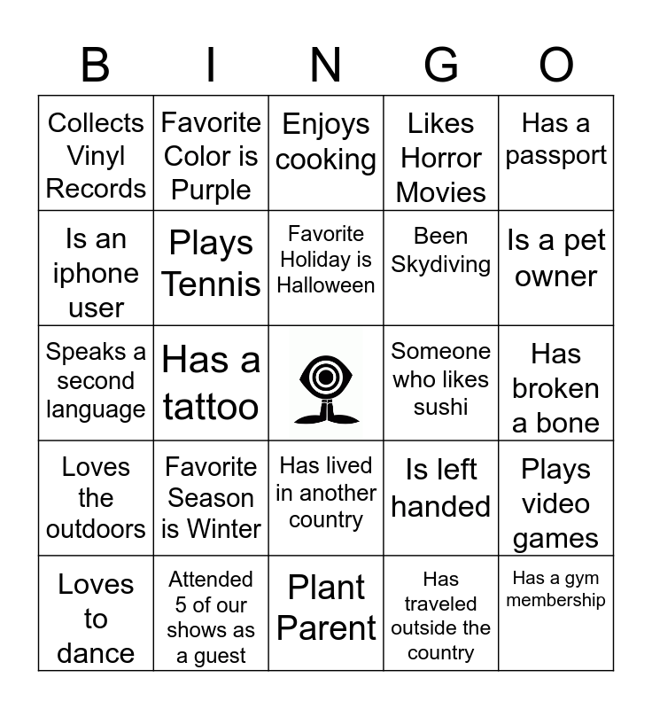 This bingo card has a free space and 39 words: Been on a cruise, Has been to Canada, Is allergic to nuts, Plays Tennis, Loves to dance, Has lived in another country, Favorite Holiday is Halloween, Has allergies, Has a passport, Loves the outdoors, Has a tattoo, Likes Horror Movies, Has a gym membership, Has broken a bone, Someone who likes sushi, Favorite Season is Winter, Rides motorcycles, Collects Vinyl Records, Is an only child, Is left handed, Is an iphone user, Plant Parent, Been Skydiving, Is a pet owner, Plays guitar, Is a DJ, Has a food Allergy, Can play an instrument, Goes to the movies once a month, Favorite Color is Purple, Has lived in another state, Is a vegetarian, Enjoys cooking, Attended 5 of our shows as a guest, Has traveled outside the country, Ran a marathon, Plays video games, Speaks a second language and Enjoys water parks.