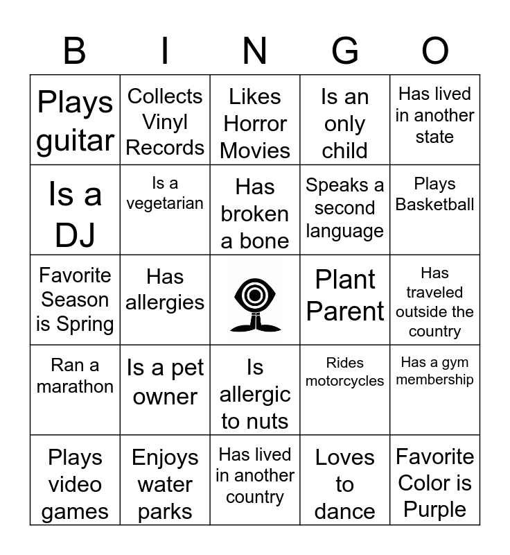 This bingo card has a free space and 39 words: Been Skydiving, Loves the outdoors, Someone who likes sushi, Is a vegetarian, Plays video games, Is allergic to nuts, Has broken a bone, Has a tattoo, Has lived in another state, Ran a marathon, Has allergies, Is an only child, Favorite Color is Purple, Has traveled outside the country, Plant Parent, Is a pet owner, Is left handed, Plays guitar, Is an iphone user, Rides motorcycles, Is a DJ, Has lived in another country, Speaks a second language, Plays Basketball, Been on a cruise, Has a food Allergy, Favorite Holiday is Halloween, Has a passport, Enjoys cooking, Collects Vinyl Records, Can play an instrument, Has been to Canada, Likes Horror Movies, Enjoys water parks, Loves to dance, Goes to the movies once a month, Has a gym membership, Favorite Season is Spring and Attended 5 of our shows as a guest.