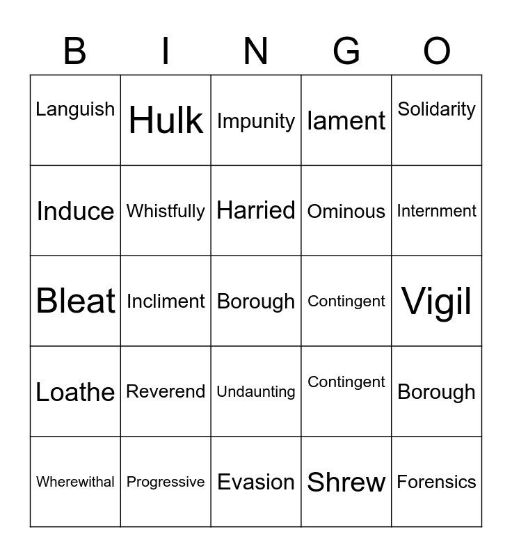 This bingo card has a free space and 34 words: Cower, Diabolical, Bloviate, Antagonistic, Vigil, Induce, Whistfully, Evasion, Ominous, Forensics, Bleat, Hulk, Shrew, Strife, Loathe, Incliment, Undaunting, Contingent, Borough, Wherewithal, Progressive, Incliment, lament, Internment, Drab, Reverend, Impunity, Colander, Solidarity, Languish, Belligerent, Harried, Contingent and Progressive.