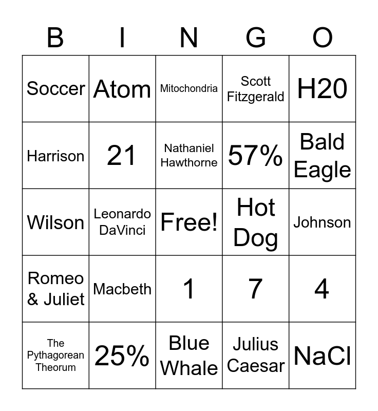 This bingo card has a free space and 29 words: The Pythagorean Theorum, 11, Leonardo DaVinci, Golf, Soccer, Mitochondria, 21, Macbeth, Hot Dog, 25%, Johnson, NaCl, Blue Whale, Julius Caesar, Bald Eagle, Hamilton, 1, Romeo & Juliet, H20, Wilson, 7, Adams Family, 57%, Harrison, Scott Fitzgerald, Atom, 4, Nathaniel Hawthorne and Shark.
