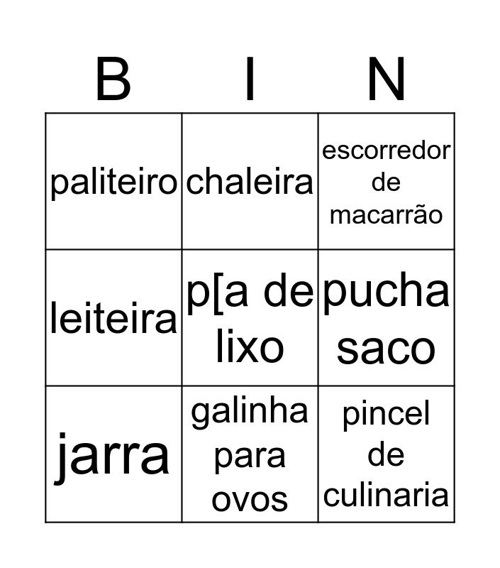 This bingo card has 48 words: funil, jarra, leiteira, espredor de limão, pano de copa, escova de banheiro, chaleira, galinha para ovos, pucha saco, funil, jarra, leiteira, espredor de limão, pano de copa, escova de banheiro, chaleira, galinha para ovos, pucha saco, pegador de panelas, p[a de lixo, pregador, saleiro, paliteiro, pincel de culinaria, port condimetos, cesto de pregador, rodo de pia, vassoura peaçava, flanela, cabide, bacia pequena, esponja de louça, pano de limpeza, blade de plastico, saco de lixo, assadeira redonda com buraco no meio, quador melita, colher de arroz, tpete para pia da cozinha, porta oleo, pote para cotonete, jogo de tapawer, escorredor de macarrão, peneira grande, forma de microondas, varal de chão, vassoura de pelo and pano de chão.