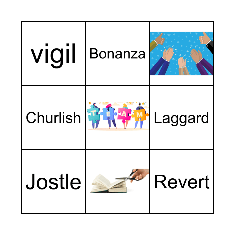 This bingo card has 3 images and 6 words: Jostle, Bonanza, Churlish, vigil, Laggard and Revert.
