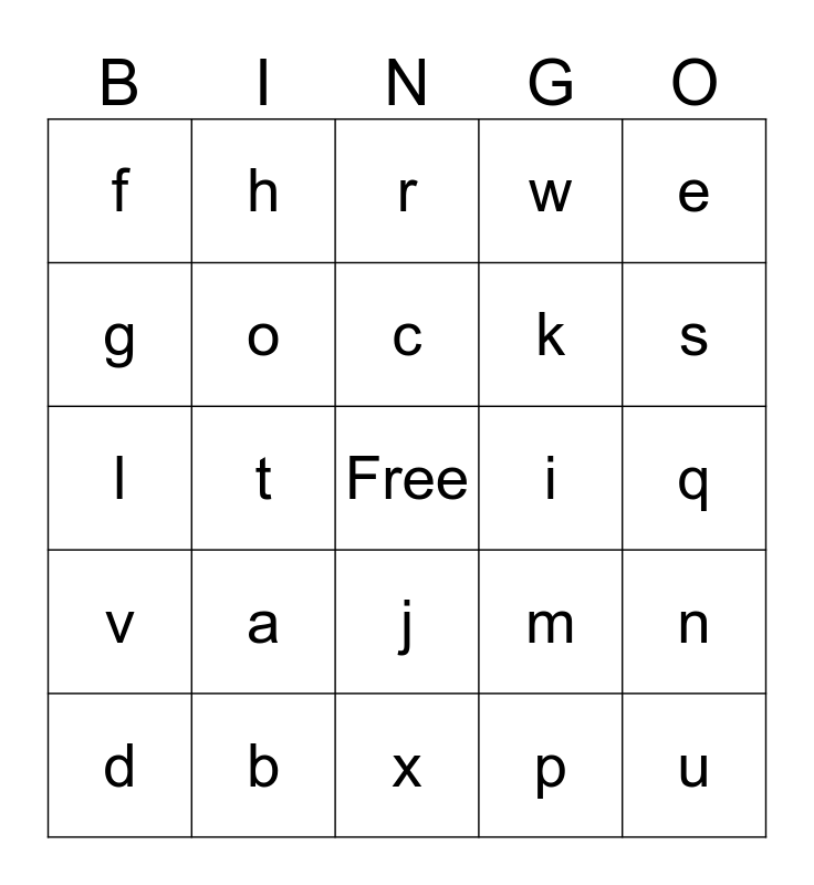 This bingo card has a free space and 24 words: a, b, c, d, e, f, g, h, i, j, k, l, m, n, o, p, q, r, s, t, u, v, w and x.