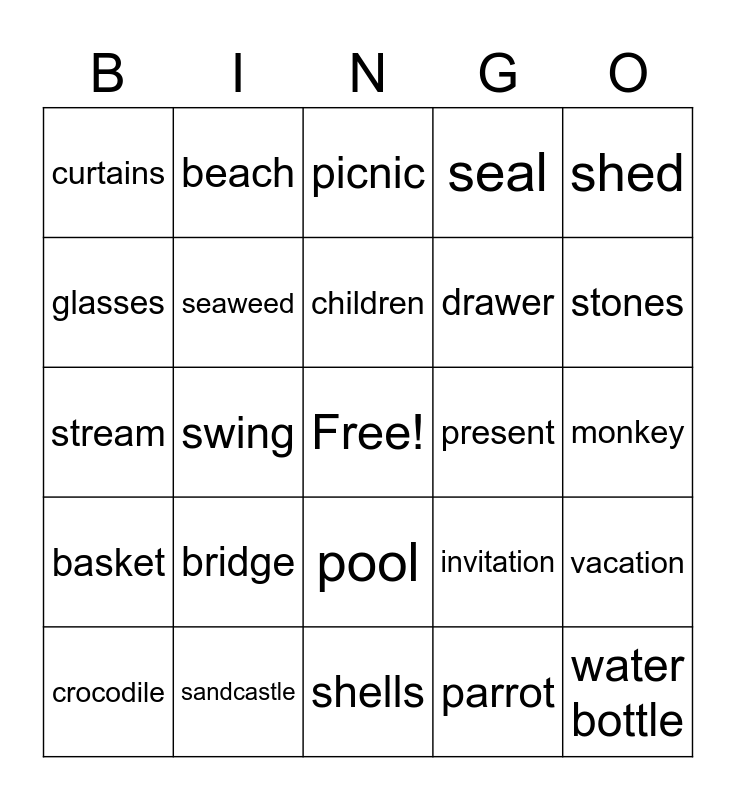 This bingo card has a free space and 24 words: bridge, sandcastle, children, crocodile, shed, curtains, glasses, beach, present, pool, drawer, stream, invitation, vacation, seaweed, parrot, monkey, picnic, stones, swing, water bottle, basket, seal and shells.