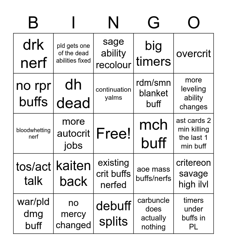 This bingo card has a free space and 24 words: kaiten back, no mercy changed, continuation yalms, war/pld dmg buff, overcrit, drk nerf, no rpr buffs, pld gets one of the dead abilities fixed, mch buff, existing crit buffs nerfed, rdm/smn blanket buff, bloodwhetting nerf, aoe mass buffs/nerfs, critereon savage high ilvl, dh dead, carbuncle does actually nothing, ast cards 2 min killing the last 1 min buff, sage ability recolour, more leveling ability changes, more autocrit jobs, timers under buffs in PL, tos/act talk, big timers and debuff splits.