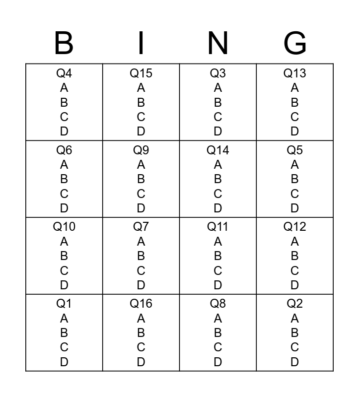 This bingo card has a free space and 15 words: Q1 A B C D, Q2 A B C D, Q3 A B C D, Q4 A B C D, Q5 A B C D, Q6 A B C D, Q7 A B C D, Q8 A B C D, Q9 A B C D, Q10 A B C D, Q12 A B C D, Q13 A B C D, Q14 A B C D, Q15 A B C D and Q16 A B C D.