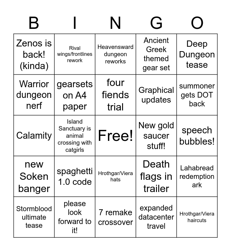 This bingo card has a free space and 24 words: spaghetti 1.0 code, please look forward to it!, four fiends trial, Stormblood ultimate tease, Deep Dungeon tease, Zenos is back!(kinda), Warrior dungeon nerf, Rival wings/frontlines rework, New gold saucer stuff!, Hrothgar/Viera hats, Graphical updates, Calamity, Death flags in trailer, Lahabread redemption ark, gearsets on A4 paper, expanded datacenter travel, speech bubbles!, Heavensward dungeon reworks, summoner gets DOT back, Island Sanctuary is animal crossing with catgirls, Hrothgar/Viera haircuts, new Soken banger, Ancient Greek themed gear set and 7 remake crossover.
