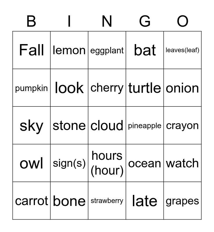 This bingo card has 25 words: sign(s), strawberry, cherry, carrot, leaves(leaf), Fall, pumpkin, lemon, pineapple, hours (hour), turtle, sky, ocean, watch, look, grapes, crayon, eggplant, onion, stone, cloud, bone, owl, bat and late.
